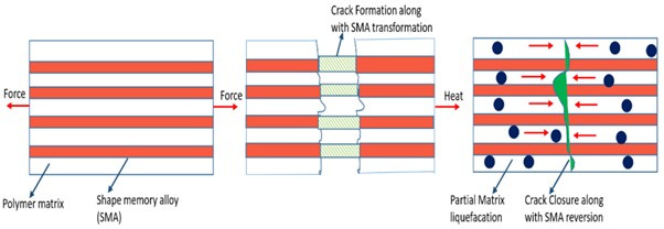 Right Panel: When heat is applied, the SMA undergoes reversion, closing the cracks. The polymer partially liquefies, filling the gaps, and the material's integrity is restored.